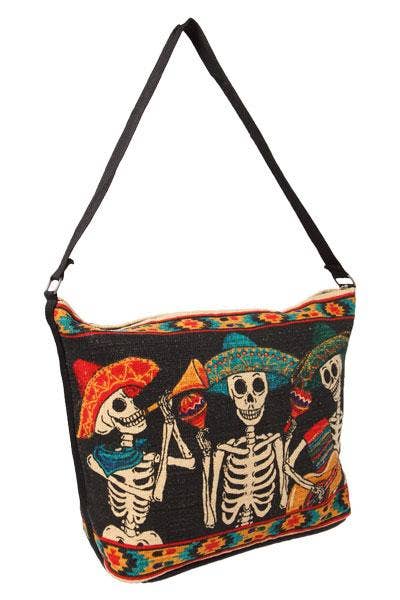 Durable Cotton Stencil Purses crafted with a sturdy zipper closure and popular Day of the Dead designs. Imported.
