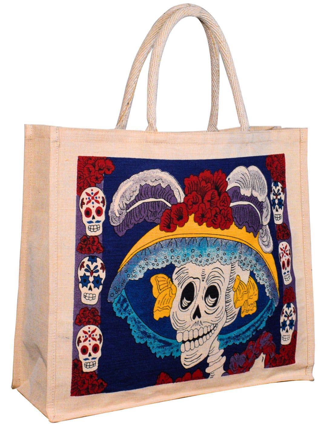 Celebrate Mexican heritage and tradition with this eco-friendly jute tote bag, featuring a stunning La Catrina design surrounded by vibrant sugar skulls. With a spacious interior and sturdy cotton straps, this tote is perfect for boutiques, gift shops, and retailers looking to offer unique, artisan-inspired accessories.